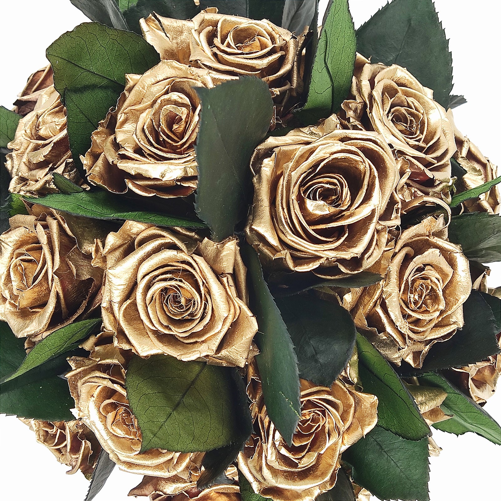 This **Golden Preserved Rose Dome** showcases a 100% natural rose delicately preserved and accented with luxurious handcrafted 24 karat gold detailing. Encased in a crystal-glass-clear dome, this exquisite piece is designed to last 3-5 years without the need for sunlight or extensive care. The gold foil adds a touch of opulence and shimmer, making it a standout decor item or a memorable gift for special occasions. With minimal maintenance required, this stunning rose dome brings long-lasting beauty, elegance, and a radiant touch to any space. Perfect for those seeking timeless luxury and a golden glow to their space.